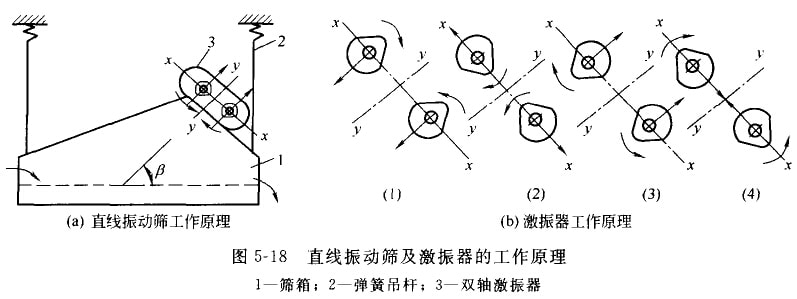 圖5-18(a)為直線振動篩工作原理。圖中篩箱1用四根彈簧吊桿2懸掛在機架或橫梁上(也有采用彈簧支承在基礎上),雙軸激振器3安裝在篩箱上,依靠激振器,實際上是由兩個單不平衡重激振器組合而成。因此,當兩個單八平衡重激振器的兩根軸同步異向回轉時,在各瞬時位置中,兩根軸上不平衡重所產生的離心慣性力,沿x方向的分力總是互相抵消,而沿y方向的分力總是互相疊加。因此,形成了單一的沿y方向的激振力,依靠此力驅動篩箱做自線住復振動。如圖5-18(b)所示,當雙不平衡重量運轉到位置(1)和(3)時,共離心力完全疊加,激振力最大;在轉到位置(2)和(4)時,其離心力完全抵消,激振力為零。直線振動篩一般是遠離共振區工作的,這時,篩箱振動的方向和激振力的方向相反,篩箱斜向振動時,物料被斜向拋起后又落下,并進行篩分。