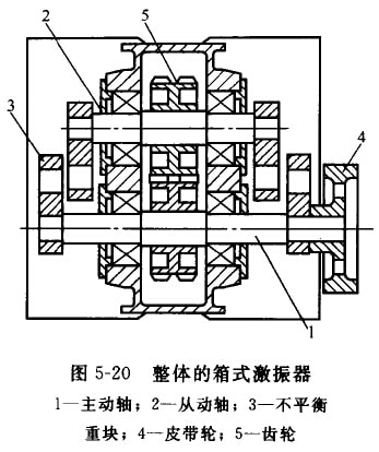 DS系列直線振動篩采用整體的箱式激振器(見圖5-20)。激振器的箱體用35號鑄俐制成。箱體內槳有主動軸1和從動軸2,軸上各有一對重 量相向的不平衡員塊(偏心塊)3,皮帶輪4帶動土軸問轉,通過一對齒輪5使從動軸做反向心同歲的回轉,利用個平衡玉回轉時產生的離 心力使激振器產牛定向的激扼力。該激振器具有以下結構特點。①平衡重塊成對地布量在激銀器箱體外面。這樣可使箱內結構緊湊;便 于調整不平衡重塊上面的配重柱塞,以改變篩稻的振幅;同時,也避免不平衡重塊回轉時,碰擊箱體內的潤滑油而引起箱體發熱。齒輪 對安裝在箱體內,使其潤滑可靠,傳動平穩。②制成整體式,沒有別分面,在承受激振力時較合理,制造簡單,但拆裝困難。
