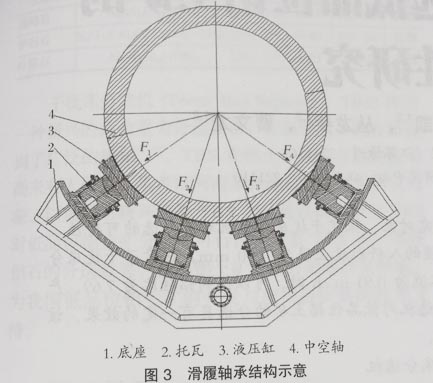 圖3可以看出,整體軸承分解為數個單獨的滑履,支撐在球磨機通體的滑環上。大型球磨機采用這個結構,在縮短2個軸承的間距,改善筒體受力狀態,進出料口尺寸不受軸頸限制,但結構復雜,成本較高,同時其調試比較麻煩。