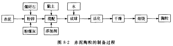 赤泥在建材工業(yè)中的其他用途還有:制備赤泥陶粒(工藝流程如圖8-2所示)、生產玻璃、流態(tài)自硬砂硬化劑,用作塑料填充劑、防滲材料、鋪路等,日前已有部分投人生產運營。但赤泥的使用量仍很低,這是由于赤泥中臺有大量堿液,有的赤泥中尚含有U、Th、Sc、La、Y、Ta、Nb等放射性元素和稀有金后,如長期身處這類建材中,將直接危害人體健康。