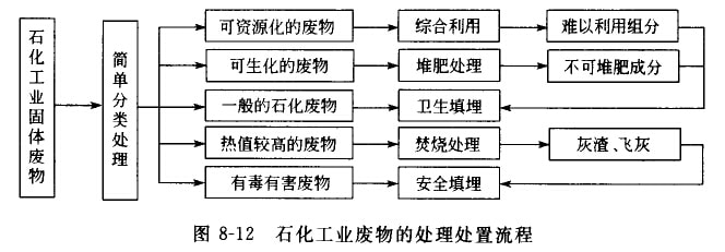 石化工業(yè)固體皮物的組成、性質(zhì)不同,處理處置方式也有差異,如圖8-12所示,經(jīng)簡單分類處理后,有綜合利用價值的廢物,如廢催化劑、白土渣、吸附劑等,經(jīng)各種方法回收有用物質(zhì)后,方可進一步處理;有機物和水分含量較高的廢物,如活性污泥、有機物殘邊等可先堆肥化處理,然后再進行無害化填埋處置;一般的工業(yè)廢物,如濾布、包裝材料、渣土等可直接進行衛(wèi)生填埋處置;熱值較高的廢物,如泊泥、廢低聚物、煉泊浮渣等可送去焚燒,產(chǎn)生的灰滔和飛灰,經(jīng)同化處理后,應(yīng)與有毒有害廢物‘道進行安全填埋處理。