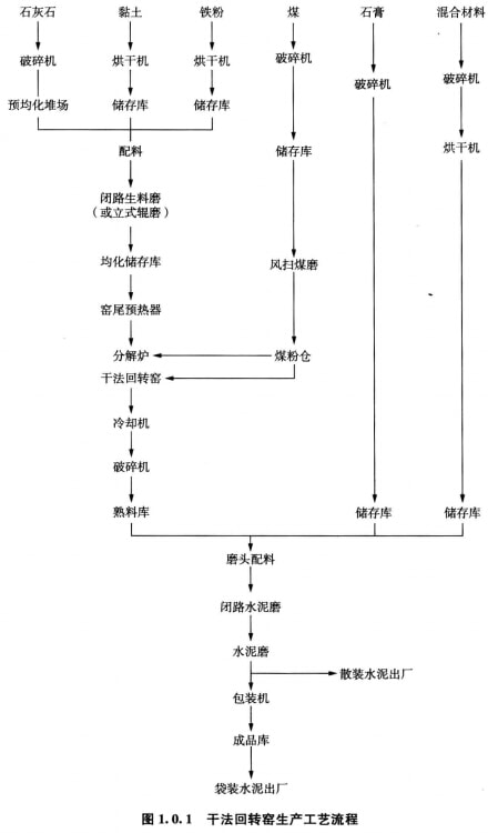 水泥生產(chǎn)工藝流程有干法回轉(zhuǎn)窯生產(chǎn)工藝流程、濕法回轉(zhuǎn)窯生產(chǎn)工藝流程和立窯生產(chǎn)工藝流程等。于法回轉(zhuǎn)窯生產(chǎn)工藝流程見(jiàn)圖1.0.1,立窯生產(chǎn)丁藝流程見(jiàn)圖1.0.2。