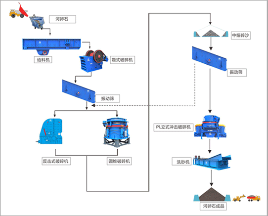 玄武巖大塊物料經料倉由振動給料機均勻喂料,輸送到顎式破碎機進行粗碎,粗碎后的物料經振動篩篩分后,由皮帶輸送機輸送至反擊式破碎機或圓錐破碎機進行中細碎。