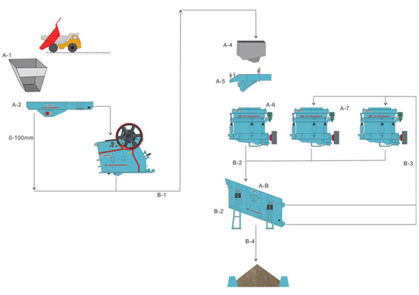 通常破碎流程主要分為兩級破碎,先由顎式破碎機將原礦石破碎成小塊兒礦石,然后送進圓錐破碎機,將小塊兒礦石破碎成0-10mm的小顆粒。