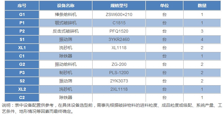 1000t/h---石灰石(白云巖)類巖石的砂石骨料生產工藝設備配置表