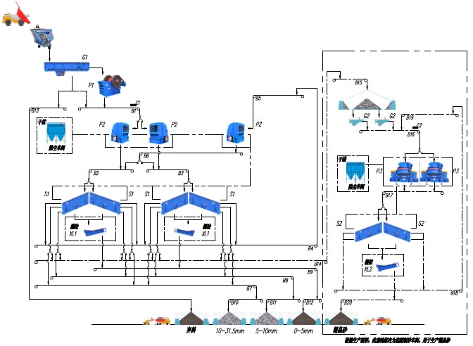 該生產線生產工藝主要適用于1000t/h石灰石(白云巖)類中等以下硬度物料的加工破碎,將經過爆破處理或開挖洞采的毛料通過棒條給料機均勻的供給顎式破碎機破碎,經顎式破碎機破碎后的半成品物料通過皮帶機輸送給反擊式破碎機進行二次破碎,經反擊破二次破碎后的混合骨料經過皮帶機輸送至一篩車間進行分級篩分,篩分過后將大于用戶需要的大顆粒物料通過皮帶機輸送至細碎反擊式破碎機再進行破碎,破碎后的物料再通過皮帶機也輸送至一篩車間進行篩分,篩分過后的不同顆粒級別的成品通過成品出料皮帶機輸送至成品料倉。不符合要求的大顆粒再次返回細碎反擊式破碎機進行循環破碎。如果成品砂需要水洗也可以配置洗砂機用于成品砂的水洗,該系統的棒條給料機還具有預篩分功能,可以將原料中的細顆粒物料提前分離直接進入后續的破碎設備,也可將原料中的泥土雜物作為棄料預先分離。