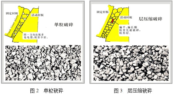 一般型號的設備為了得到較小的產品得把排料口調整得較小或利用特殊形狀的腔形,此種破碎是一個個的單粒直接壓縮的破碎方式,其結果是破碎機能力不能充分發揮,另外也因原料的負荷變動、水分等影響性能受明顯影響,造成通過量小,細粒的生產量也小,偏平偏長的產品多粒形不好(圖2),產品強度低,機械負荷大,機械的耐久性不好,有時不能平穩運轉。為了從根本上解決問題,破碎機改變了細碎的概念:加大排料口間隙,即使出口間隙大,只要滿足適當壓縮的做功條件,就有可能生產出更多的細粒產品。實現層壓縮破碎的設備出口間隙大并利用特殊的破碎腔形成復數的粒子層、提高破碎腔內的巖石密度、將破碎能量充分加給巖石,以達到破碎的目的(圖3)。為了實現層壓縮破碎,均勻布料裝置不可缺少,以防止原料粒度偏析、達到穩定運轉,破碎壁與軋臼壁磨損均一,零部件壽命長;為了實現層壓縮破碎,自動控制系統也不可缺少,該系統隨時監視液壓系統的壓力值、主電機的電流值及料位,根據負荷條件自動調整排料口間隙,以便能在最大負荷下運轉,獲得更大的產量及更好的粒形(圖4)。單粒破碎一般等于排料口尺寸的產品產量約占通過量的50%,層壓縮破碎一般等于排料口尺寸的產品約占通過量的70-80%(圖5)。