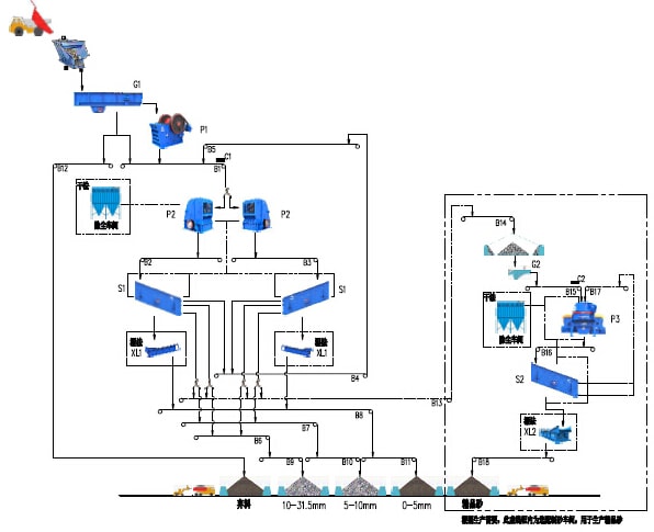 根據(jù)工程的需要,該系統(tǒng)也可以配置制砂系統(tǒng),用于生產(chǎn)合理級配的精品砂(如虛線框內(nèi)所示),當(dāng)需要生產(chǎn)精品砂時,可以從一篩篩分車間篩分后分離出5-40mm的混合物料通過皮帶機(jī)輸送至制砂車間的半成品料倉,再通過振動給料機(jī)將物料均勻的給至制砂機(jī),經(jīng)過制砂機(jī)破碎后的成品混合料再通過皮帶輸送機(jī)輸送至二篩篩分車間進(jìn)行篩分,從而分離出不同顆粒級別的成品。