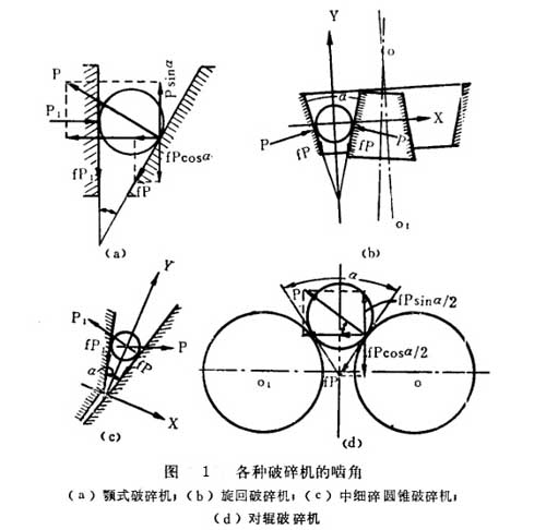 破碎機的嚙角是決定破碎機能否順利破碎礦石的重要條件, 嚙角愈小,排礦口愈大,破碎比就愈小,礦石容易通過,生產率也就大。反之,嚙角愈大,排礦口愈小,破碎比愈大,礦石難以通過,故生產率也就小。如果嚙角過大,破碎礦石時,將使礦石 向上跳動而不能破碎,甚至會發生安全事故。如果嚙角太小,則破碎比太小難以滿足工藝過程的要求。所以破碎機的嚙角應該適當。破碎機的最大(極限)嚙角由破碎物料與破碎工作面之間的 摩擦系數決定,可以用力的分析法求出。