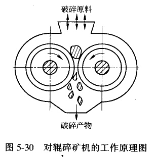 對(duì)輥破碎機(jī)的工作原理如圖5-30所示。物料從上面加入破碎機(jī),兩個(gè)圓輥相向旋轉(zhuǎn),由于物料與輥面的摩擦力將物料卷入破碎腔小,被輥?zhàn)铀鶋核椤R哑扑榈牡V石,在重力作用下,從兩個(gè)輥?zhàn)娱g的間隙處排出。