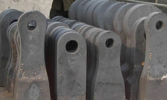 2、進料粒度小于200mm的中小型破碎機可采用單重50kg以下的錘頭,由于受沖擊力相對較小,普通高錳鋼加工硬化能力不足,因而不耐磨,應選擇含碳量較高的合金高錳鋼或中低碳合金鋼。
