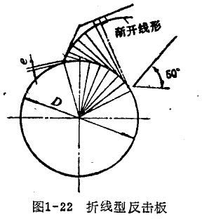 反擊板是反擊式破碎機的主要部件。反擊扳的型式有折線型和弧線型兩類。漸開線型反擊板(圖1-22)的主要特點是:物料以垂直于反擊板的方向沖擊到反擊板上,因此可獲得最佳的破碎效果。但是由于漸開線型反擊面制作困難,而且實際破碎時,由于料塊在腔內相互間的干擾,其運行軌跡已不規則,故通常采用近似漸開綏的折線型反擊板代之。