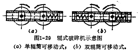 雙輥筒的輥式破碎機又可分為單輥可移動式和雙輥可移動式兩種(圖1-29)。輥筒的驅動分單輥驅動(由一個電動機和一套傳動系統組成)和雙輥驅動(兩個輥簡分別由兩個電動機和兩旁傳動系統組成)。