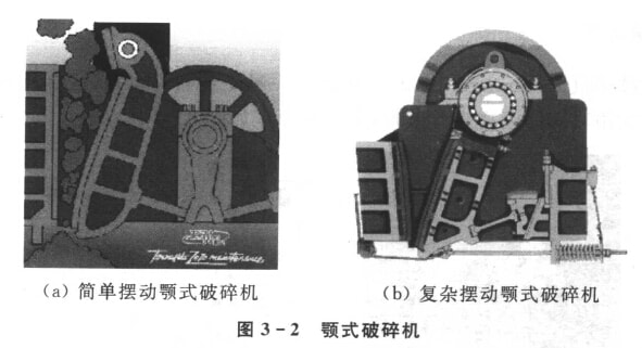 顎式破碎機(jī)(Jaw Crusher)俗稱“老虎口”,廣泛用于選礦、建材、硅酸鹽和化學(xué)工業(yè)部門。如圖3-2所示,顎式破碎機(jī)有簡單擺動式和復(fù)雜擺動式兩種類型。