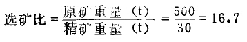 原礦重量與精礦重量之比叫選礦比。它表示選出一噸精礦需處則幾噸原礦。如上例的選礦比為: