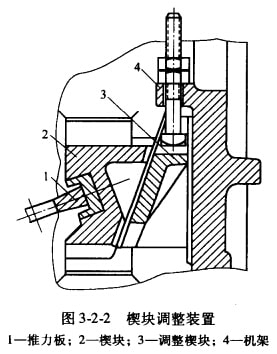 (2)楔塊調(diào)整。借助后推力板支座與機(jī)架后壁之間的兩個楔塊的相對移動來實現(xiàn)破碎機(jī)排礦口的調(diào)整(圖3-2-2)。轉(zhuǎn)動螺栓上的螺帽,使調(diào)整楔塊3沿著機(jī)架4的后壁做上升或下降移動,帶動前楔塊2向前或向后移動;從而推動報力板或動領(lǐng),以達(dá)到排礦口調(diào)整的目的。此法可以達(dá)到無級調(diào)整,調(diào)整方便,節(jié)省時間,不必停車調(diào)整,但增加了機(jī)器的尺寸和質(zhì)量。中、小型額式破碎機(jī)常常采用這種調(diào)整裝置。