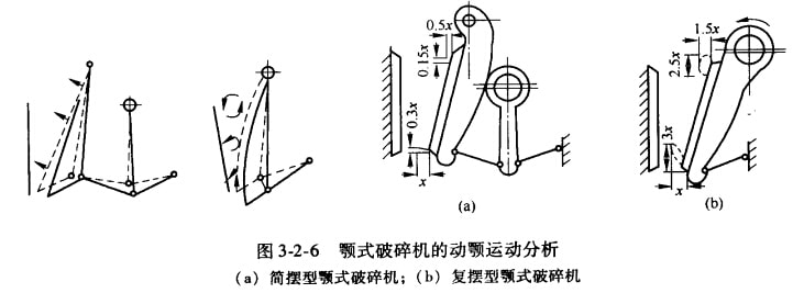 顎式破碎機(jī)動顎運(yùn)動的軌跡見圖3-2-6。在簡擺型顎式破碎機(jī)中,動顎以中心軸為中心而擺動一段圓弧,其下端的擺動行程較大,上端較小。擺動行程可分為水平的與垂直的兩個分量,視結(jié)構(gòu)的幾何關(guān)系而定,其比例大致如圖3-2-6a所示。復(fù)擺型顎式破碎機(jī)的運(yùn)動軌跡較為復(fù)雜,動領(lǐng)上端的運(yùn)動軌跡近似為圓形,下端的運(yùn)動軌跡近似為橢圓形。其行程的水平與垂直分量的比例大致如圖3-2-6b所示。簡擺型與復(fù)擺型領(lǐng)式破碎機(jī)動領(lǐng)運(yùn)動的另一個區(qū)別,就是在簡擺型中,動顎上端均下端同時靠近固定顎或遠(yuǎn)離固定顎,即動顎上端與下端的運(yùn)動是同步的;而在復(fù)擺型中,動顎上端與下端的運(yùn)動是異步的,例如,當(dāng)動顎上端朝向固定顎運(yùn)動,下端卻向相反于固定顎的力向運(yùn)動。換句話說,在某些時刻,動顎上端正在破碎物料,下端卻正在排出物料,或反之。