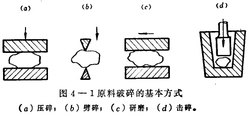 為了衡量原料在破碎前后粒度變化的程度和均衡分配備個破碎階段的工作量,常引用破碎比這一概念來表示原料的破碎過程。破碎比是原料在破碎前的最大粒度與破碎后的最大粒度之比值。破碎比取決于破碎機械的類型和構造,也與送入破碎機的料塊大小有關。一般預碎階段的破碎比為2-10,中碎階段為2-8,細碎階段為10-20。不同破碎機械的破碎比不同,其破碎方式也不同,根據破碎機給予料塊的破碎力,原料的破碎方式大體可分為四種:壓碎、劈碎、研磨和擊碎,如圖4-1所示。