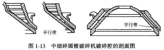 中細(xì)碎圓錐破砷機可分為彈簧型圓錐破碎機及液壓型圓錐破碎機兩種。液壓型圓錐破碎機又有單缸及多缸兩種。多缸液壓圓錐破碎機,由于油路比較復(fù)雜,而且工作沒有單缸液壓的可靠,因此在目前已經(jīng)不再制造了,只有在已有這種設(shè)備的廠礦中才能見到。以上兩種圓錐破碎機,每種又可分為標(biāo)準(zhǔn)型、中間型及短頭型三種。這三種型式破碎機的基本構(gòu)造和工作原理完全相同,只是在破碎腔的形狀略有不同,如圖1-13所示。