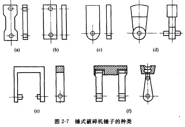 圖2-7(a)、(b)、(c)適用于破碎100-200mm的軟質和中等硬度的物料,每個錘重從3.5-15kg不等。圖2-7(a)、(b)是兩端帶孔的,即當磨損后可以調換4次使用。圖2-7(d)是比較重型的,它的重心離中心較遠,故可用于破碎大塊(300mm以上)的中等硬度物料,錘重30-60kg。因2-7(e)、(f)主要用于較堅硬的物料,重達50-120kg。由于錘頭受物料的磨損作用,其端部打擊面很快磨損,因此多用錳鋼。