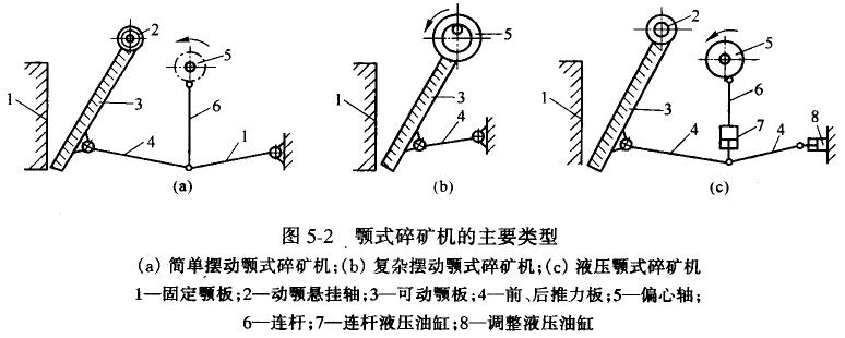 顎式破碎機的類型很多,目前在我國選礦廠中使用最廣的主要有簡單擺動顎式破碎機(如圖5-2a)和復(fù)雜擺動顎式破碎機(如圖5-2b)兩種類型。這兩種顎式破碎機的工作原理基本上是相似的,只是動顎的運動軌跡有較大的差別。近年來,由于液壓技術(shù)的應(yīng)用,在簡單擺動顎式破碎機的基礎(chǔ)上制成了液壓顎式破碎機,如圖5-2c所示,在選礦廠也開始應(yīng)用。