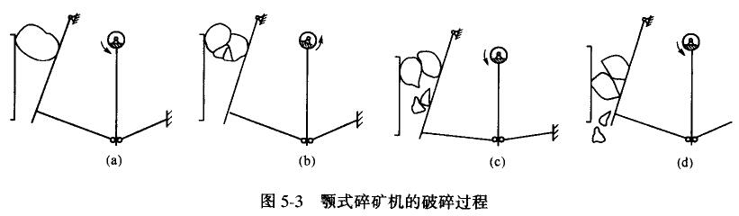 圖5-3為一大塊物料在顎式破碎機中被破碎的過程。因5-3a是動顎板張到最大的位置,即動顎離固定顎最遠,此時物料進入破碎腔。圖5-3b是動顎逐漸向固定顎靠近,物料受擠壓,劈裂和折斷的作用產(chǎn)生裂縫而被破碎。圖5-3c是動顎靠近固定顎最近的位置,被破碎的物料分為幾個小塊。圖5-3d是動領(lǐng)又張到最大位置,被破碎了的物料由于自重下落而從排礦口排出,大于排礦口的則落至下部與新給人的物料再次受到破碎。
