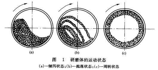 由于磨機轉速的變化。一定量的研磨體可出現三種情況。磨機轉速太快,研磨體與物料粘附筒體一起回轉,稱為"周轉狀態",研磨體對物料起不到沖擊和研磨作用。當磨機轉速太慢,研磨體和物料因摩擦力的作用被簡體帶到等于動摩擦角的高度時,研磨體和物料就下滑,稱為"傾瀉狀態"。對物料有研磨作用而沒有沖擊作用,粉磨效率不高。當磨機轉速適中時,研磨體提升到一定高度后拋落下來、稱為"拋落狀態",研磨體對物料有較大的沖擊和研磨作用,粉磨效率高。參見圖l。