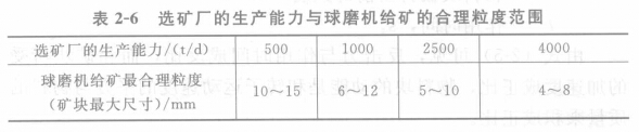 最終碎礦粒度的大小和選礦廠的規(guī)模有很大的關(guān)系,見(jiàn)表2-6 所列。