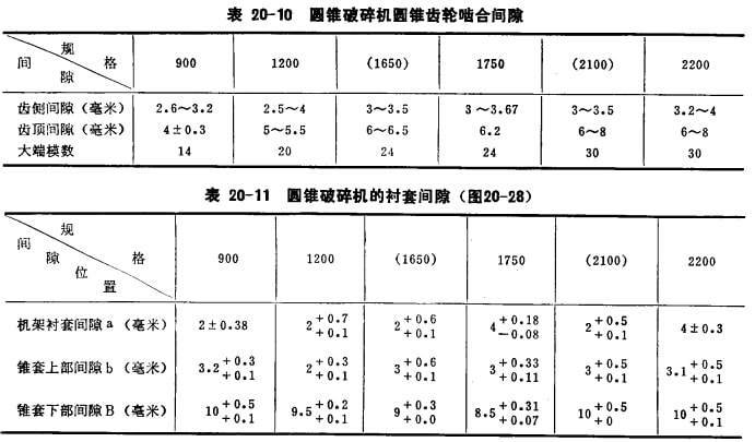 安裝旋回式破碎機和圓錐破碎機偏心軸套部時,應特別洽態(tài)調整好齒輪的嚙合性能。圓錐齒輪的接觸面積應占齒寬和齒長的50%左右,安裝后齒頂間隙(在齒外端測量)一般應為(0.2—0.3)m,m為模數。表20—10是圓錐破碎機的合理齒輪嚙合間隙。