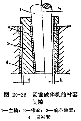 圓錐破碎機偏心軸套3(圖20—28)與機架直襯套4的間隙a的大小,以及主軸1與其錐套2的上下間隙b與B的大小可見表20—11。這些間隙極為重要,過大會引起工作不正常,過小會引起發(fā)熱甚至會發(fā)d:抱勃事故。間隙a上下一樣;但主軸與錐套的間隙必須保證上小下大(即b小B大),因為只有這樣才能保證主軸繞其軸線上一點作旋回擺動。