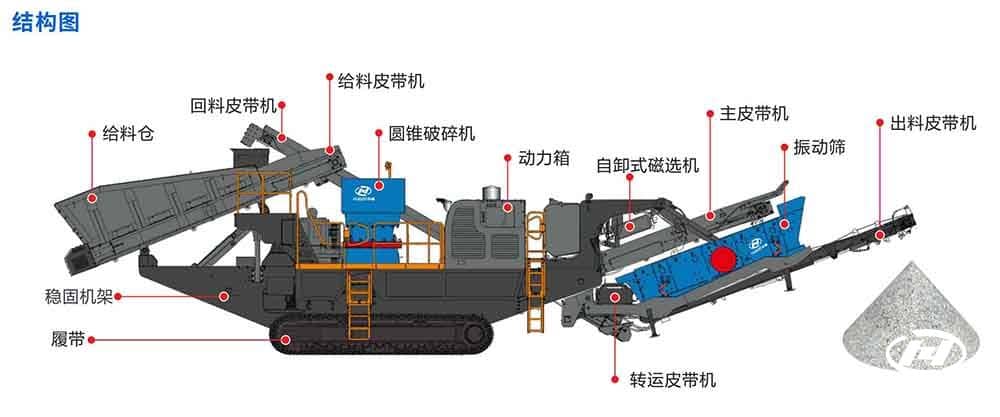 注::①關于破碎設備處理能力與石料硬度、給料粒度、出料粒度相關。②標配:主皮帶和尾料皮帶配折疊技術、PLC+顯示器、除鐵器、無線遙控控制。③選配:全液壓驅動、返料系統、除塵器噴淋系統、柴油灌注泵、有線遙控、集中潤滑系統。④鑒于我公司技術不斷更新,及時參數變動恕不另行通知,具體參數以實物為準。
